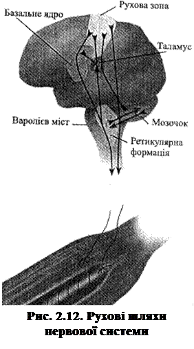 По мірі переміщення рівня здійснення контролю від спинного мозку до рухової зони кори головного мозку збільшується складність рухів від простих рефлексів до ускладнених рухів, виконання котрих потребує участі розумових процесів. Рухові реакції більш складних рухів, як правило, беруть свій початок у руховій зоні кори головного мозку. Деякі рухові шляхи показано нарис. 2.12.