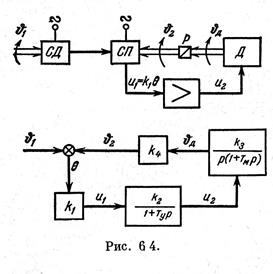 Для иллюстрации применения критерия Гурвица рассмотрим пример на определение устойчивости дистанционной следящей системы. Принципиальная и структурная схемы изображены на рис.6.4. В качестве чувствительного элемента использованы два сельсина (СД и СП), включенные по трансформаторной схеме. Передаточная функция сельсинов равна коэффициенту передачи схемы: