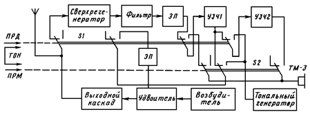 Сверхрегенеративный каскад приемника выполняет функцию усилителя радиочастоты, амплитудного детектора и АРУ. Напряжение входного радиосигнала детектируется и через RС-фильтр поступает на вход эмиттерного повторителя (ЭП). Двухкаскадный усилитель звуковой частоты (УЗЧ) обеспечивает стабильность выходного сигнала приемника при изменении напряжения батареи. Особенностью его является экономичность в работе и отсутствие переходного трансформатора. На выходе УЗЧ через согласующий трансформатор подключается микротелефон ТМ-3.