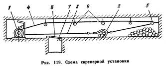 Скреперная установка состоит из лебедки, скрепера (скребка), троса (каната) и блочков Лебедка обеспечивает возвратно-поступательное движение скребка с рабочим и