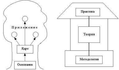 5. Когнитивно-графічні елементи «Древо» і «Будинок» будуються за принципом блок-схем. Тут важлива послідовність основних компонентів у досліджуваній теорії: підстава – ядро – додаток. У підставі, як правило, представлені опорні поняття, факти, способи дій, актуалізація яких необхідна для вивчення її ядра. Додаток містить навчальний матеріал, що забезпечує реалізацію внутріпредметних, міжпредметних зв'язків і вихід на практику. Спеціальні дослідження про вплив форми пред'явлення ООД на результат засвоєння показує, що ці моделі ефективно впливають на процес навчання, тому що техніка їхньої побудови ґрунтується на методі сходження від абстрактного до конкретного. «Будинок» теми доцільно використовувати для відбиття структури якої-небудь фундаментальної теорії, вивчення якої необхідно надалі при вивченні багатьох тим. Схематично «Будинок» складається з «фундаменту» (методологічний рівень), «корпуса» (теоретичний рівень), «даху» (прикладний рівень). На малюнку 5.4. показаний варіант подання когнитивно-графічних моделей «Древо» і «Будинок».