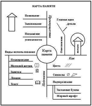 9. Карта пам'яті найбільшою мірою наближає форму запису до природної роботи мозку по сприйняттю інформації і її передачі. У процесі словесної взаємодії розуму доводиться сортувати фрагменти різноманітної, випадкової й хаотичної інформації, одночасно здійснювати відбір, формулювання, організацію матеріалу з урахуванням слів і ідей, що виникають на підсвідомому рівні. Слухачі аналізують кожне слово в контексті попередньої й наступної інформації й тільки після цього, ґрунтуючись на власному сприйнятті й досвіді, дають інтерпретацію значення слів. Карта пам'яті дозволяє поєднувати зорові й почуттєві асоціації у вигляді взаємозалежних ідей, аналогічно тому, як це виглядає на дорожній карті. Складання карт пам'яті рекомендують починати із центра чистого аркуша, куди поміщають головну ідею (або тему), містять неї в ромб, коло або іншу фігуру, що привертає увагу. Від центра розходяться відгалуження, що відповідають ключовим моментам або розділам. Кожне відгалуження має свій колір. На галузях виписується ключове слово або фраза й залишається місце для додавання деталей у процесі подальшої роботи. У карту пам'яті вводяться символи й малюнки для полегшення її запам'ятовування. На малюнку 5.10. представлена карта пам'яті, що відображає процес складання карт пам'яті.