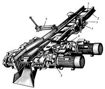 Уголь с забойного конвейера попадает на перегружатель и с него – на штрековый конвейер. Перегрузка (рис.5) с забойного К. на штрековый К. происходит или с набегом забойного К. на перегружатель, или с боковой разгрузкой, или с угловым конвейером.
