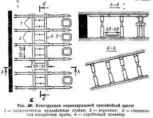 Индивидуальные крепи (рис 6) состоят из несущих и поддерживающих элементов (стоек 1 и верхняков 2 ), разбираемых при переноске.