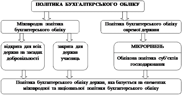 Політику бухгалтерского обліку можна розуміти і як сферу діяльності державних органів, які визначають правові обмеження та норм ведення бухгалтерського обліку у державі, галузі діяльності чи на підприємстві. У цьому випадку ії класифікують за територіальною ознакою (рис. 2).