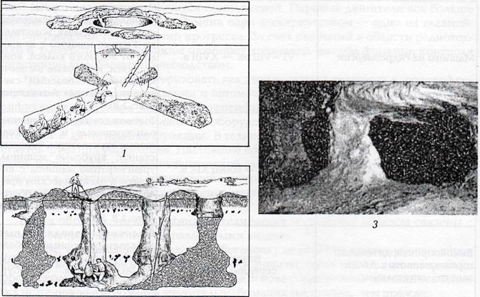 1 — путем проходки горизонтальных выработок из вертикальных шурфов в Грамс-Грейвс (Великобритания); 2 — путем проходки вертикальных выработок (шурфов) в районе Красного Села (Белоруссия); 3 — древние горные выработки