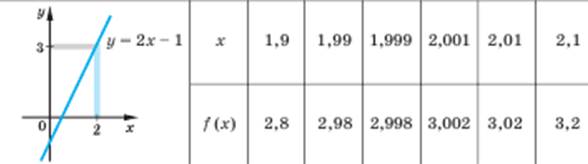 Нехай задано деяку функцію, наприклад, f(x) = 2х – 1. Розглянемо графік цієї функції та таблицю її значень у точках, які на числовій прямій розташовані достатньо близько до числа 2.