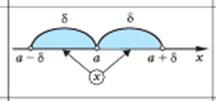 | Число В називається границею функції f(x) у точці а (при х, що прямує до а), якщо для будь-якого додатного числа знайдеться таке додатне число , що при всіх х а, які задовольняють нерівності , виконується нерівність