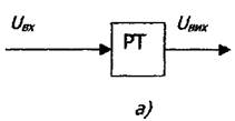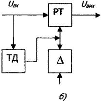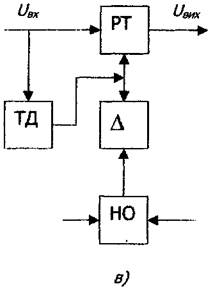 Структурна схема складається в послідовності (рисунок ), що визначається функцій ними зв'язками її елементів. Першим повинен бути .зображений регулюючий транзистор РТ (рисунок а), т.я. ефект стабілізації напруги виникає завдяки його вихідній провідності. Вхідне коло РТ живиться струмом від струмостабілізуючого двополюсника ТД (рисунок б). Керується провідністю РТ підсилювач, у вихідне коло якого відходить деяки частина стабільного струму.