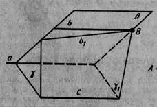 Випадок, коли прямі а, b, с лежать в одній площині, був розглянутий у планіметрії. Тому припустимо, що наші прямі не лежать в одній площині. Нехай β - площина, в якій лежать прямі а і b, а γ - площина, у якій лежать прямі аіс. Площини β і γ різні (рис. 13). Візьмемо на прямій b довільну точку В и проведемо площину γ1 через пряму с і точку В. Вона перетне площину β по прямій b1.