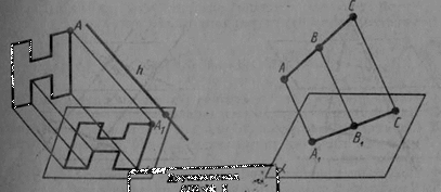 Для зображення просторових фігур на площині, як правило, користуються паралельним проектуванням. Розглянемо цей спосіб зображення фігури. Беремо довільну пряму h, яка перетинає площину рисунка α, проводимо через довільну точку А фігури пряму, паралельну h. Точка А1 перетину цієї прямої з площиною рисунка буде зображенням точки А (рис. 29). Побудувавши таким чином зображення кожної точки фігури, дістанемо зображення самої фігури. Такий спосіб зображення просторової фігури на площині відповідає зоровому сприйманню фігури під час розглядання її здалеку.