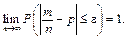 Теорема Бернуллі. Нехай m — кількість появ події А в серії n незалежних випробовувань, у кожному з яких подія А відбувається з імовірністю p. Тоді для довільного e > 0 справджується рівність