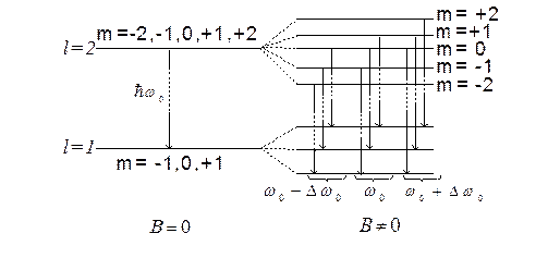 Між розщепленими рівнями можливі переходи електронів у відповідності з правилами відбору (рис. 1.16)