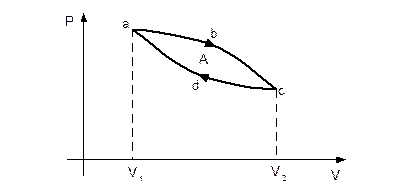 При розширенні газ виконує позитивну роботу A1, рівну площі під кривою abc, при стиску газ виконує негативну роботу A2, рівну за модулем площі під кривою cda. Повна робота за цикл A = A1 + A2 дорівнює на (p, V) діаграмі площі циклу. Робота A > 0, якщо цикл обходиться за годинниковою стрілкою, і A < 0, якщо цикл обходиться в протилежному напрямку.