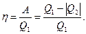Робота A, виконана робочим тілом за цикл, дорівнює отриманій за цикл кількості теплоти Q. Відношення роботи A до кількості теплоти Q1, отриманій робочим тілом за цикл від нагрівача, називається коефіцієнтом корисної дії η теплової машини