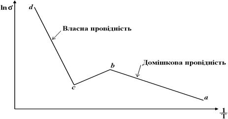 На цій залежності ділянка “ab” визначає провідність напівпровідника за рахунок лише домішкових акцепторних або донорних атомів. Ділянка “cd” – визначає лише власну провідність напівпровідника.