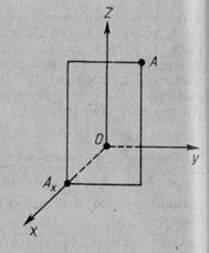 Візьмемо тепер довільну точку А и проведемо через неї площину, паралельну площині уz (рис. 4). Вона перетне вісь х у деякій точці Ах. Координатою х точки А називається число, рівне по абсолютній величині довжині відрізка ОАХ: додатне, якщо точка Ах лежить на додатній півосі х, і від’ємне, якщо вона лежить на від’ємній півосі. Якщо точка Ах збігається із точкою О, то вважаємо, що х = 0. Аналогічно визначаємо координати у и z точки А. Координати точки будемо записувати в дужках поруч із літерним позначенням точки: