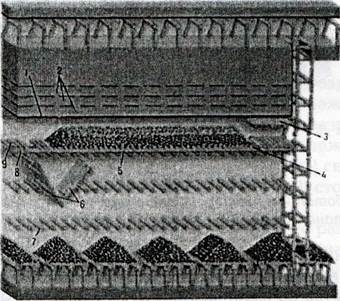1 — потолочина; 2 — слои полезного ископаемого; 3 — временный полок; 4 — выпускные окна; 5 — настил; 6 — отбойные рештаки; 7 — распорки; 8 — прогоны; 9 — накатник