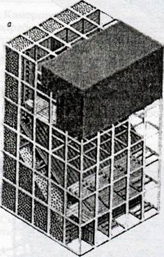 Следует отметить, что существуют отдельные переходные разновидности систем с креплением, которые почти в одинаковой мере можно отнести к классу систем с открытым очистным пространством, т. к. здесь для поддержания вмещающих пород используются одновременно и играют почти равную роль как крепь так и рудные целики (рис. 6.76). Условимся относить такие системы преимущественно к классу систем с креплением, имея в виду, что в этом случае очистное пространство в значительной степени заполнено крепью, а не является открытым