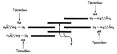 Рис. 712071610. Схематическое изображение фибриногена, его структуры (АαВβγ)2, заряженных концов, сайтов расщепления тромбином (стрелки) четырех пептидных связей Arg-Gly.