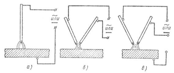 Рис. 2. Электрическая дуга: а - прямого действия, б - косвенного действия, в - комбинированного действия.