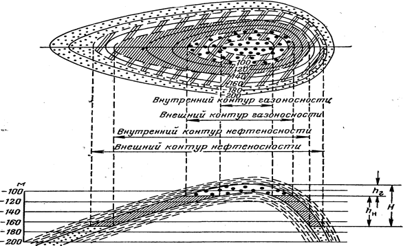 Части пласта: 1 — водяная, 2 — водонефтяная, 3 — нефтяная, 4 — газонефтяная, 5 — газовая; 6 — породы-коллекторы; Н — высота залежи; hг, hн — высоты соответственно газовой шапки и нефтяной части залежи.