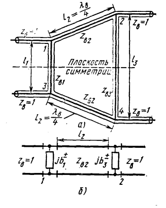 , выполненного в виде замкнутого кольца из четырех отрезков линий передачи (для определенности коаксиальных волноводов) с Т-волной (рис. 3.9, а). Волновые сопротивления