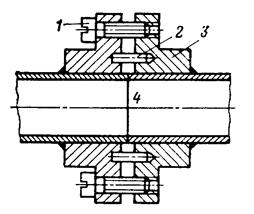 У наиболее простых по устройству контактных фланцев (рис. 18.15) волноводы стягиваются винтами 1 и гладкими фланцами 3, несколько смещенными от плоскостей обреза 4; это обеспечивает плотность соединения и надежный электрический контакт между фланцами. Направляющие штифты 2 устраняют смещение волноводов.