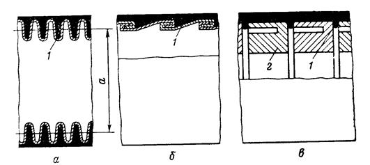 Резонансный гибкий волновод (панцирный волновод) (рис. 18.18,в) состоит из последовательного ряда дроссельных секций 2, осуществляющих замыкание по высокой частоте в местах разрыва волновода. Зазоры между секциями обеспечивают возможность небольших смещений секций. Чем больше секций, тем больше может быть угол изгиба или скручивания. Дроссельные секции выполняются в виде шайб толщиной примерно L /4; при этом отражения волн, возникающие в соседних разрывах волновода, взаимно компенсируются. Шайбы крепятся в резиновом кожухе 1, обеспечивающем необходимую гибкость и герметичность. Панцирный волновод имеет повышенные потери за счет просачивания электромагнитной энергии в зазоры между секциями и поэтому всегда применяется в виде коротких отрезков. Для экранировки резонансного гибкого волновода применяется гибкая металлическая сетка.