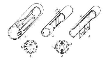 На рис. 18.38 показаны эскизы секций с металлической вставкой (рис. 18.38,а) и со штырями (рис. 18.38,б - для Dy=p/2 и рис. 18.38,e - для Dy=p) применительно к круглому волноводу с волной типа Н11. Аналогичные устройства могут быть использованы и в секциях с квадратным волноводом.