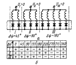 а - схема соединения диодов; б - знаки напряжений на диодах секций при различных фазовых сдвигах.