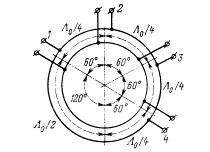 Электромагнитные волны от плеча 2 расходятся в обе стороны, имея одинаковые амплитуды и фазы. Разность хода противоположно распространяющихся волн до плеч 1 и 3 одинакова и равна длине волны. Поэтому на входах этих плеч бегущие в обе стороны волны складываются в фазе, образуя пучность напряжения. Разность хода вола от плеча 2 до плеча 4 равна L0/2. Поэтому на входе плеча 4 образуется узел напряжения и электромагнитные колебания не проходят в плечо 4. Таким образом, плечи 2 и 4 оказываются развязанными.
