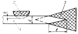Аттенюатор или нагрузка в полосковой линии могут быть образованы путем подпаивания кусков поглощающейленты определенной формы к диэлектрической пластине и к центральному проводнику полосковой линии (рис. 5.15). Подбором формы поглощающей ленты можно получитьКбв не хуже 0,95 в 20%-ном диапазоне частот и не хуже 0,83 в двухкратном диапазоне. Величина затухания аттенюатора определяется величиной h. Аттенюатор выполненный так, как показано на рис. 5.15, может обеспечить затухание не более 7 дб. Для получения больших ослаблении небольшой участок центрального проводника заменяется поглощающим материалом.