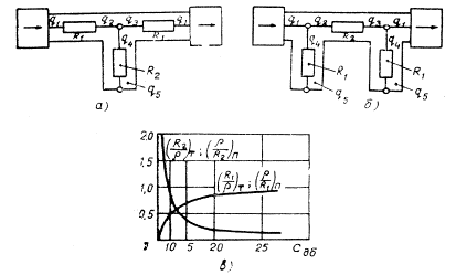 На рис. 5.11, в приведены кривые зависимости нормированных относительно r сопротивлений R1 и R2 от затухания Сдб для Т-образной н П-образной ячеек. Из рисунка видно, что нормированные сопротивления