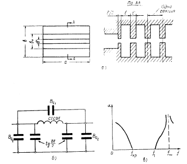 Ширина волновода а остается постоянной (рис. 4.19, а). Нижняя граница полосы прозрачности гофрированного фильтра, определяемая критической частотой самого волновода, имеет малую крутизну, поэтому эти фильтры в волноводной технике обычно используют как фильтры нижних частот. Эквивалентная схема звена фильтра и частотная характеристика приведены на рис. 4.19, б.