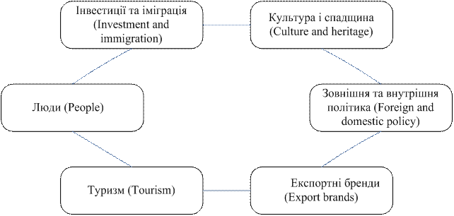 У 2002 році один з провідних світових фахівців в області брендінга Саймон Анхольт вперше як термін спожив фразу «брендінг місць» [19]. Анхольт став основним розробником комплексного, диверсифікованого підходу до брендінгу територій на противагу вузькоспеціалізованому, сфокусованому на якомусь одному аспекті (наприклад, туризмі). Анхольт створив концепцію конкурентної ідентичності, представивши її у вигляді шестикутника (рис. 10), який показує шість елементів сучасного бренду території: туризм, експортні бренди, політику, бізнес і інвестиції, культуру, людей [20].