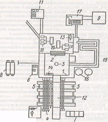 В общем случае (Рисунок 2.29) в центре буровой вышки 1 располагают ротор 3, а рядом с ним — лебедку 2. За ней находятся буровые насосы 19, силовой привод 18, площадка горюче-смазочных материалов 11, площадка для хранения глинопорошка и химреагентов 9 и глиномешалка 17. С противоположной стороны от лебедки находится стеллаж мелкого инструмента 14, стеллажи 5 для укладки бурильных труб 4, приемные мостки 12, площадка отработанных долот 7 и площадка ловильного инструмента 10 (его используют для ликвидации аварий). Кроме того, вокруг буровой размещаются хозяйственная будка 8, инструментальная площадка 6, очистная система 15 для использованного бурового раствора и запасные емкости 16 для хранения бурового раствора, реагентов и воды.