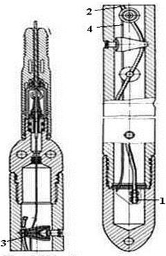 1 — взрывной патрон; 2 — детонирующий шнур; 3 — кумулятивный заряд; 4 — электропровод