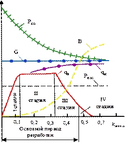 давление: Рпл — пластовое, Рнас — насыщение; годовые отборы: qк — нефти, qж — жидкость; В — обводненность продукции; G — промысловый газовый фактор; kизвл.н — коэффициент извлечения нефти
