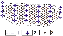1 — контур нефтеносности; Скважины: 2 — нагнетательные; 3 — добывающие