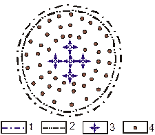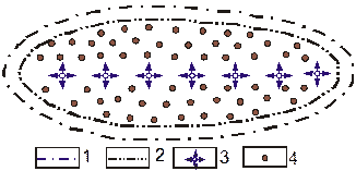 | Рисунок 3.9 — Разновидность системы со сводовым заводнением Контуры нефтеносности: 1 — внешний; 2 — внутренний; Скважины: 3 — нагнетательные, 4 — добывающие |