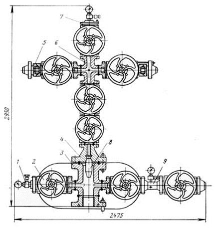 для однорядного подъемника: 1 — вентиль, 2 — задвижка, 3 — крестовина, 4 — катушка для подвески НКТ, 5 — штуцер, 6 — крестовины ёлки, 7 — буфер, 8 — патрубок для подвески НКТ, 9 — катушка