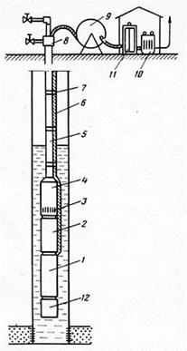 Погружные центробежные электронасосы — это многоступенчатые центробежные насосы с числом ступеней в одном блоке до 120, приводимые во вращение погружным электродвигателем специальной конструкции). Электродвигатель питается с поверхности электроэнергией, подводимой по кабелю от повышающего автотрансформатора или трансформатора через станцию управления, в которой сосредоточена вся контрольно-измерительная аппаратура и автоматика. Погружные центробежные электронасосы опускаются в скважину под расчетный динамический уровень обычно на 150 - 300 м. Жидкость подается по НКТ, к внешней стороне которых прикреплен специальными поясками электрокабель. В насосном агрегате между самим насосом и электродвигателем имеется промежуточное звено, называемое протектором или гидрозащитой. Установка погружного центробежного электронасоса (Рисунок 4.10) включает маслозаполненный электродвигатель ПЭД 1; звено гидрозащиты или протектор 2; приемную сетку насоса для забора жидкости 3; многоступенчатый центробежный насос ПЦЭН 4; НКТ 5; бронированный трехжильный электрокабель 6; пояски для крепления кабеля к НКТ 7; устьевую арматуру 8; барабан для намотки кабеля при спуско-подъемных работах и хранения некоторого запаса кабеля 9; трансформатор или автотрансформатор 10; станцию управления с автоматикой 11 и компенсатор 12.