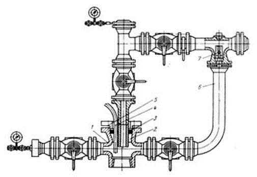 Типичная арматура устья скважины, оборудованной для эксплуатации УЭЦН (рисунок 4.11), состоит из крестовины 1, которая навинчивается на обсадную колонну.