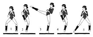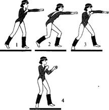 Комбинация 4 (рис. 5.4): в левой диагональной стойке прямой удар левой рукой (1) + прямой удар правой рукой (2) + прямой удар правой ногой (3) + смена стойки на правую диагональную (4).