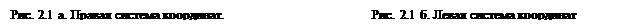 Существуют две, не сводящиеся друг к другу, системы координат: правая система координати левая система координат. Различить эти системы координат можно следующим образом: если посмотреть из любой положительной точки оси OZ на ось OY и ось OX окажется справа, то это правая система координат, если слева - левая (сравните рис.2.1а и рис.2.1б).
