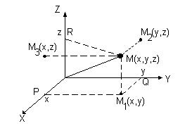Каждой пространственной точке M можно сопоставить ориентированный отрезок OM, берущий начало в точке начала координат и оканчивающийся в точке M (рис.2.2). Такой отрезок называют радиус-вектором точкиM. Спроектируем точку М на оси координат. Каждой точке M соответствуют три точки на осях (на рис.2.2 P, Q, R), их координаты называют координатамиточкиM. Они однозначно определяют положение этой точки в выбранной системе координат. Наоборот, задав на каждой из осей координат по одной точке, например, P, Q, и R, мы определим одну и только одну точку в пространстве. Эта точка получается при пересечении трех взаимно перпендикулярных плоскостей PM1MM3, QM1MM2, RM2MM3, проходящих соответственно через точки P, Q и R параллельно осям координат. Расстоянием между двумя точкамиM(x1,y1,z1) и N(x2,y2,z2). в пространственазывается число d, равное длине отрезка прямой соединяющей эти точки