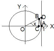 Построим тригонометрический круг с радиусом ОА = 1. Прямая DA – ось тангенсов. Возьмем на окружности точку В. Радиус ОВ = 1. Соединим точки А и В. Угол ВОА равен х, ВС = sin x, DA = tgx (рис. 4.1)