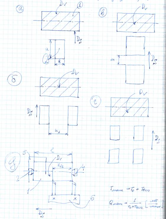 Рассмотрим основные способы построения станочной операции. На рис. «а» представлена схема одноинструментальной одноместной обработки. Здесь и на поледующих рисунках дана схема фрезерования на горизонтально-фрезерном станке цилиндрической фрезой 1 плоскости на заготовке 2. (Здесь и далее дан вид в плане (сверху) на стол фрезерного станка.) Обрабатываемая заготовка 2 с движением подачи Ds перемещается вместе со столом в зону резания фрезы, которая вращается с заданной скоростью резания. На рис. «б» представлена схема одноинструментальной параллельной обработки 2 деталей. На рис. «в» — схема схема одноинструментальной последовательной обработки 2 заготовок. На рис. «г» — схема одноинструментальной фрезерной параллельной обработки 4 деталей. И на рис. «д» показана токарная обработка. Здесь обрабатывается заготовка 1 (валик длиной l), установленная в центрах токарного станка: передний центр 2, задний центр 4. Передний центр располагается в шпинделе токарного станка, задний центр — в задней бабке токарного станка. Крутящий момент от шпинделя на обратный вал передаётся через [подводковое] устройство 3. Обработка ведётся двумя резцами 5, которые установлены на расстоянии l/2, т. е. делят длину обработки на 2 равные части. (Резцы токарные проходные.) Использование двух резцов за счёт уменьшения длины обработки повышает производительность. Эта схема представляет собой многоинструментальную одноместную обработку.
