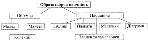 - площинні (таблиці, плакати, монтажі, діаграми, малюнки, записи та замальовки на дошці).